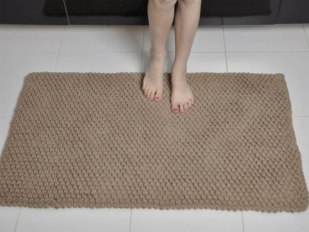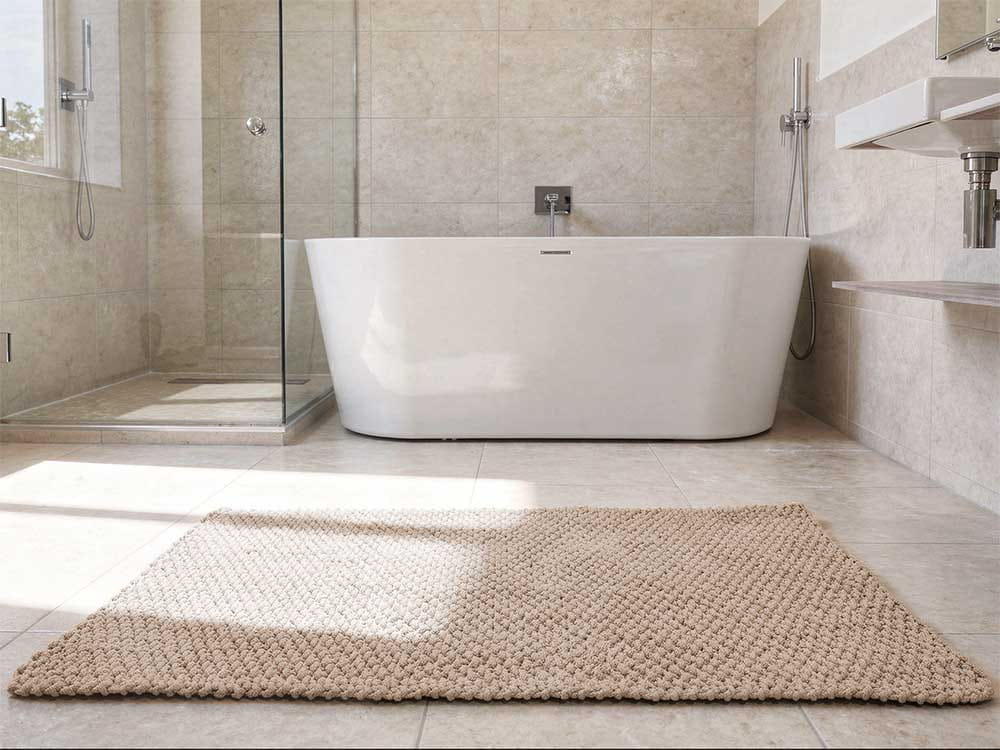 Miękki, gruby i cudownie ciepły beżowy dywanik, zamienia zimne kafelki w przyjemną powierzchnię pod stopami. Po kąpieli daje uczucie komfortu, a jego nieregularna faktura dodaje wnętrzu charakteru. Antypoślizgowe podszycie z naturalnej bawełny chroni domowników przed poślizgnięciem. Oddychające właściwości roślinnych włókien zapewniają doskonałą cyrkulację powietrza, dzięki czemu dywanik można używać przy ogrzewaniu podłogowym.