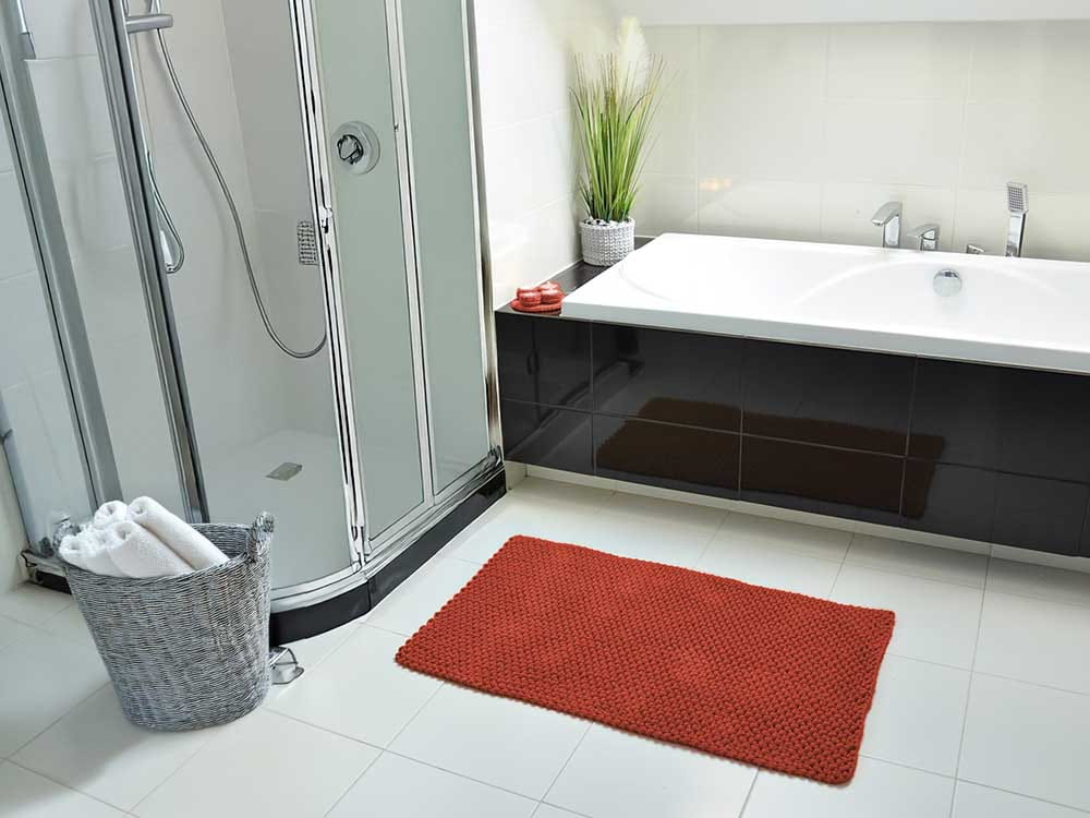 Przekonaj się jak łatwo odmienisz swoją łazienkę wprowadzając mocne kolory. Czerwony dywanik łazienkowy dodaje niesamowitej energii. Świetnie komponuje się z łazienkami urządzonymi w grafitowych i czarnych kolorach. Uzupełniając łazienkę o czerwone dodatki zyskasz niepowtarzalny i niezwykle atrakcyjny pokój kąpielowy. Jeśli masz łazienkę w jasnych, naturalnych kolorach stworzysz mocny kontrast z delikatnymi dodatkami. A może czerwony dywanik łazienkowy a do tego czerwone dodatki takie jak koszyki, ręczniki, szlafroki. Olśniewający efekt murowany.